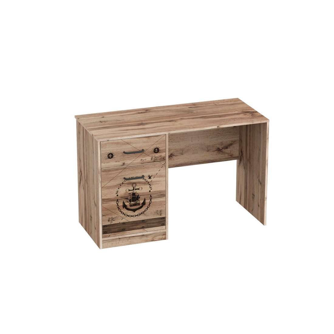 Прямой десткий письменный стол Фрегат один из элементов удивительной коллекции, которая привлекаетвнимание Вашего ребенка красочными рисунками пиратских карт на фасадах изделий. Письменный стол однотумбовый, функционально очень удобный, имеет ящик для тетрадок или карандашей, а так же полочку, спрятанную за фасадом дверцы.