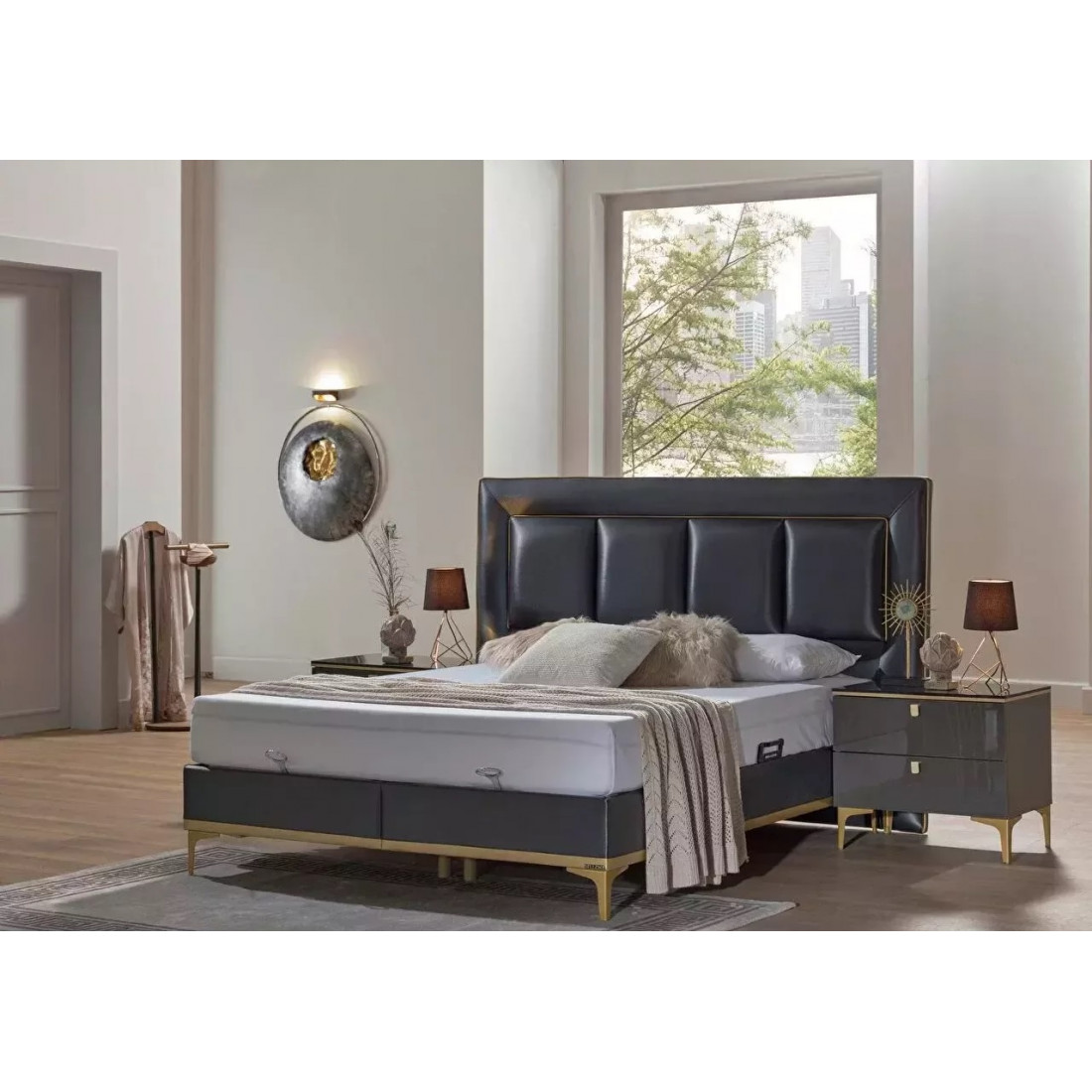 Кровать (база) без спинки CARLINO, щитовой конструкции на декоративных ножках c подъемным жестким основанием под матрас. Щитовой каркас кровати плита ЛДСП т.18мм, дно плита МДФ 6мм. Каркас обит поролоном, винилискожей двух цветов, основного цвета и в нижней части обивка винилискожа контрастного золотого цвета. Жесткое основание кровати рамочной металлической конструкции на основе трубы профильной размером 20х30,20х20 с подъемным механизмом. Настил основания поролон т.3мм, основание обито тканью. Сборка каркаса базы на шкант, скобу металлическую, уголок пластмассовый. Подъемный механизм устанавливается при помощи винтов и винтов с гайками. Ножки кровати пластмассовые, четыре ножки декоративные, шесть опорных круглых ножек, ввинчивающихся для двойных баз. На дно базы устанавливается аэратор пластмассовый с логотипом Bellona для кондиционирования воздуха. Ручка -держатель для подъемного основания металлическая.