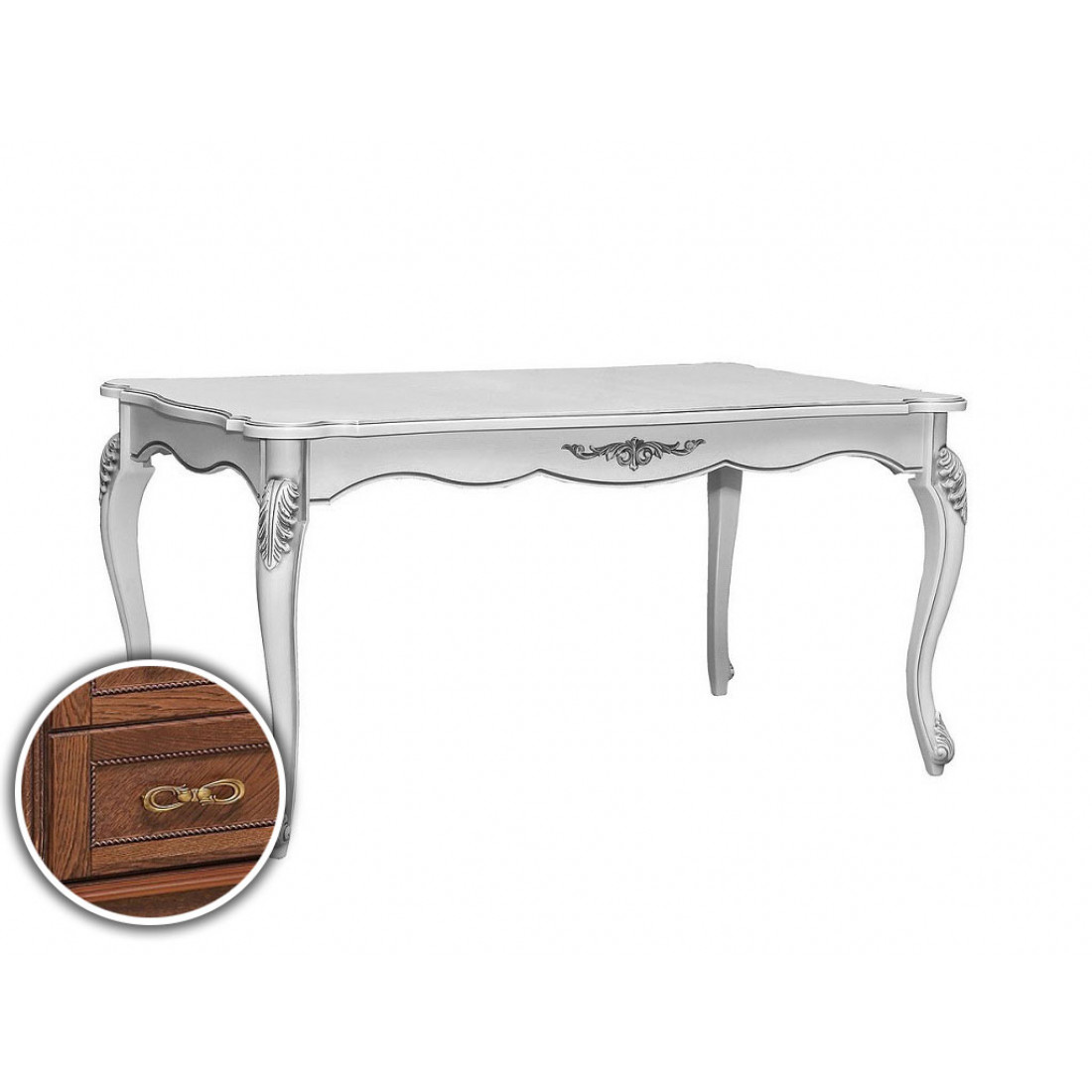 Стол «Алези 3» (модели П 353.07) с крышкой, имеющей декоративное профильное фрезерование кромок, из плиты древесноволокнистой средней плотности (плита МДФ), облицованной шпоном древесины по технологии "интарсия (инкрустация)", установленной на четыре точеные ножки из пиломатериалов лиственных или хвойных пород. Продольные и поперечные царги с фигурной нижней стороной и имеющими декоративное профильное фрезерование кромок и лицевой пласти, из пиломатериалов лиственных или хвойных пород. Продольные царги имеют декоративные накладные элементы.