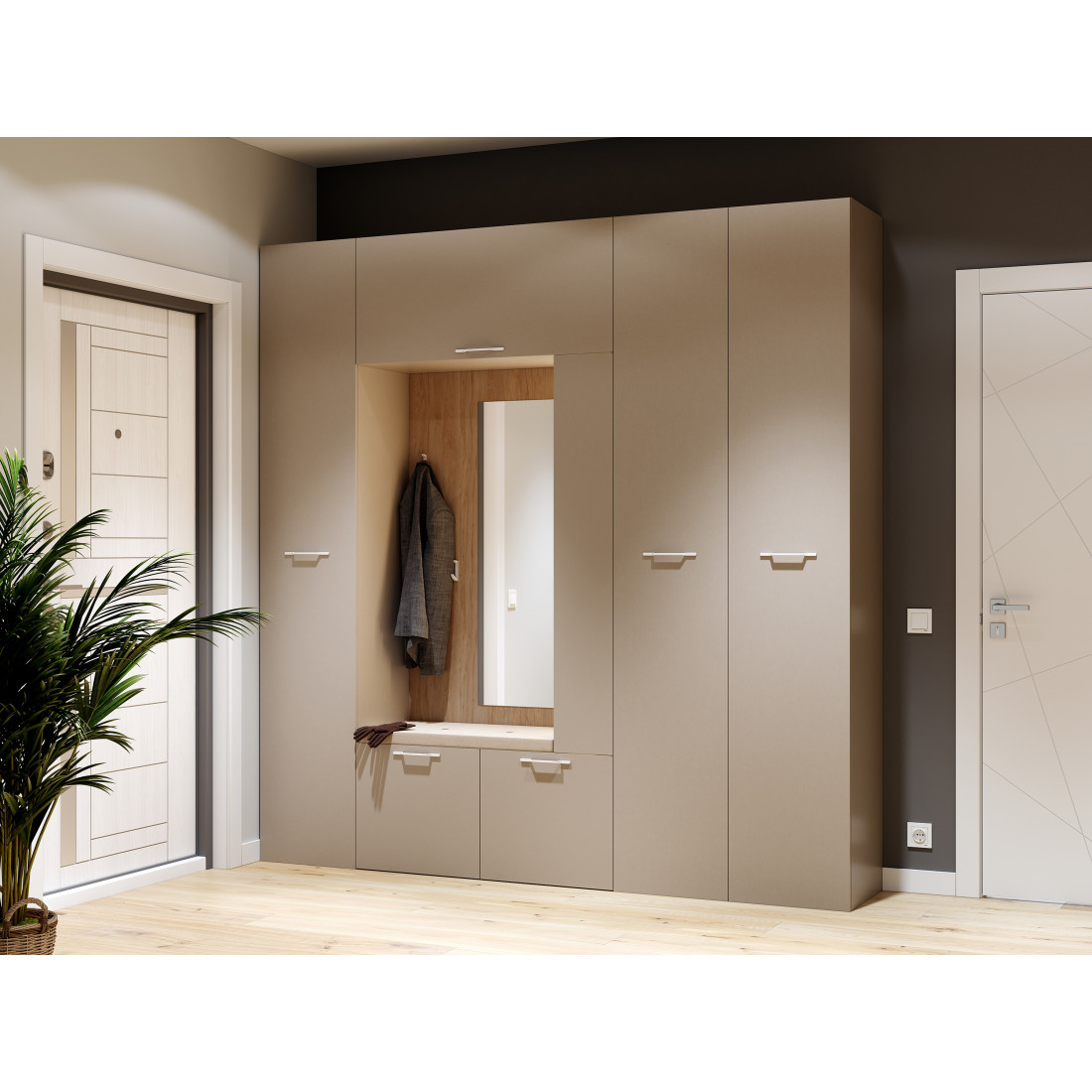 “Джерси” выполнена в красивом теплом оттенке капучино, который придает ей особую элегантность и изысканность. Этот цвет отлично сочетается с другими оттенками в интерьере, делая прихожую универсальным элементом декора.