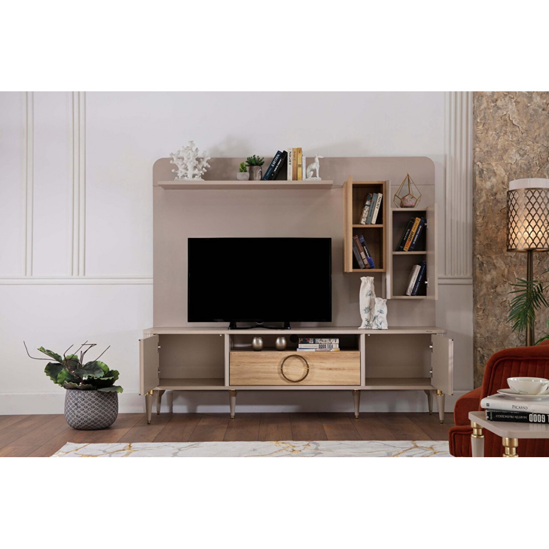 Стенка под ТВ Санвито SANV-15а - небольшая компактная стенка в стиле неоклассика, ар деко. Продолжая развивать коллекцию Санвито (SANVITO), турецкий бренд Беллона предлагает свои покупателям композицию SANV-15а из 3х модулей:Тумбы под ТВ SANV-15 +Часть мебельной стенки (панель+полка) SANV-15PP+Часть мебельной стенки (шкаф )SANV-15D.